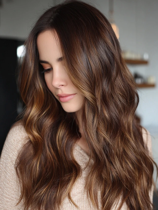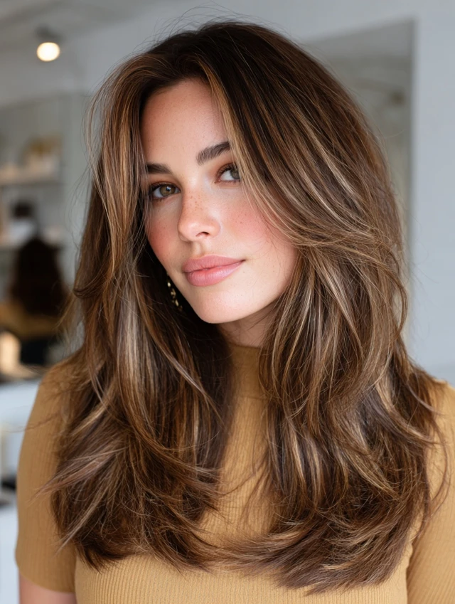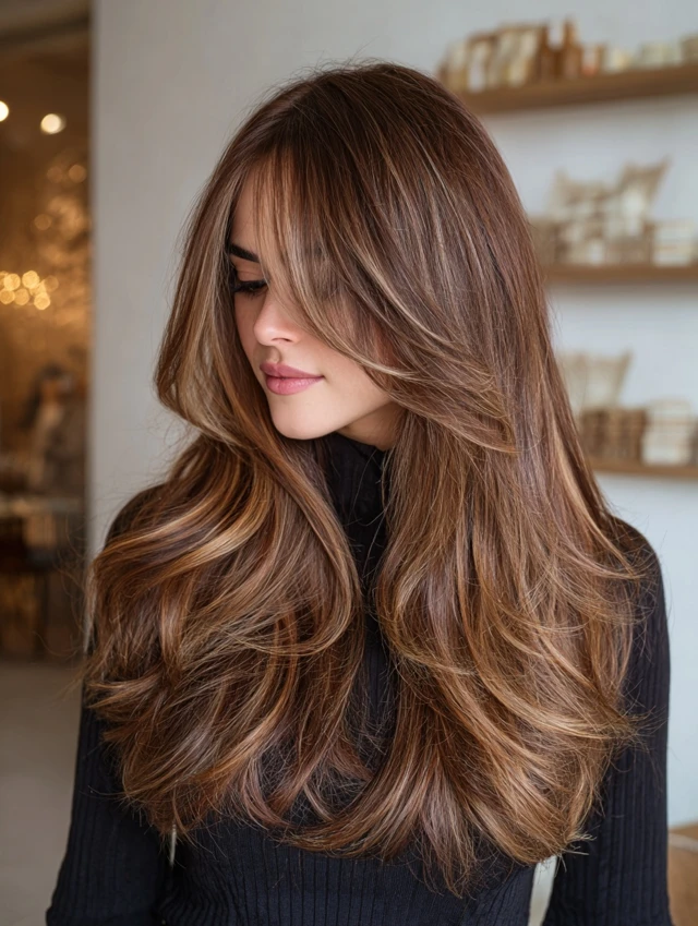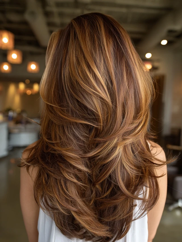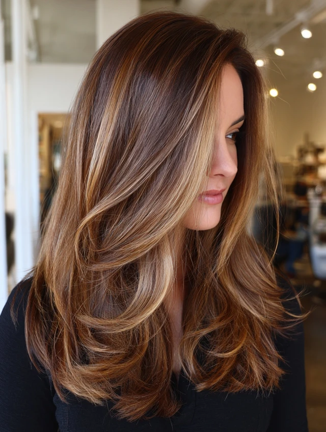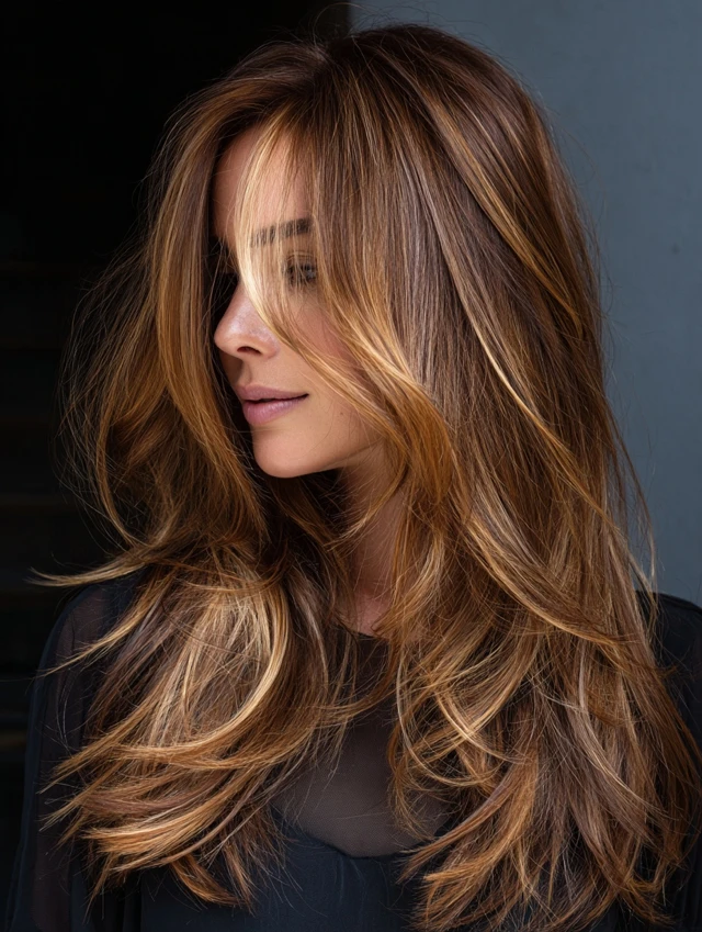 Long layers allow caramel hair with brown highlights to flow naturally. The length enhances the dimension and movement.