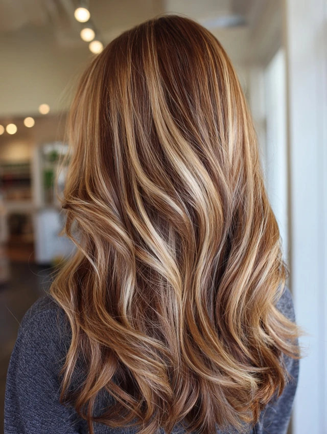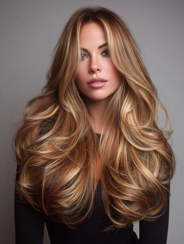 Golden caramel hair with light brown highlights creates a sunlit effect that feels radiant and natural. The tones flow smoothly together.