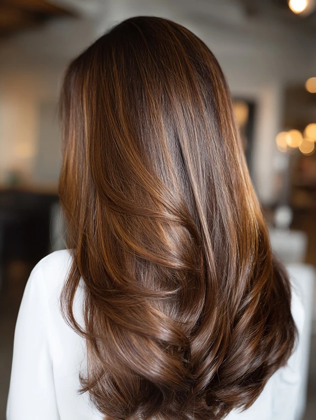 Caramel hair with brown highlights blends warm, golden tones with deeper brunette shades to create a rich, dimensional look. Instead of high contrast, this combination focuses on depth, softness, and natural movement. The caramel tones add brightness and warmth, while the brown highlights ground the color, preventing it from looking overly light. The result is a balanced, glossy finish that feels both modern and timeless.