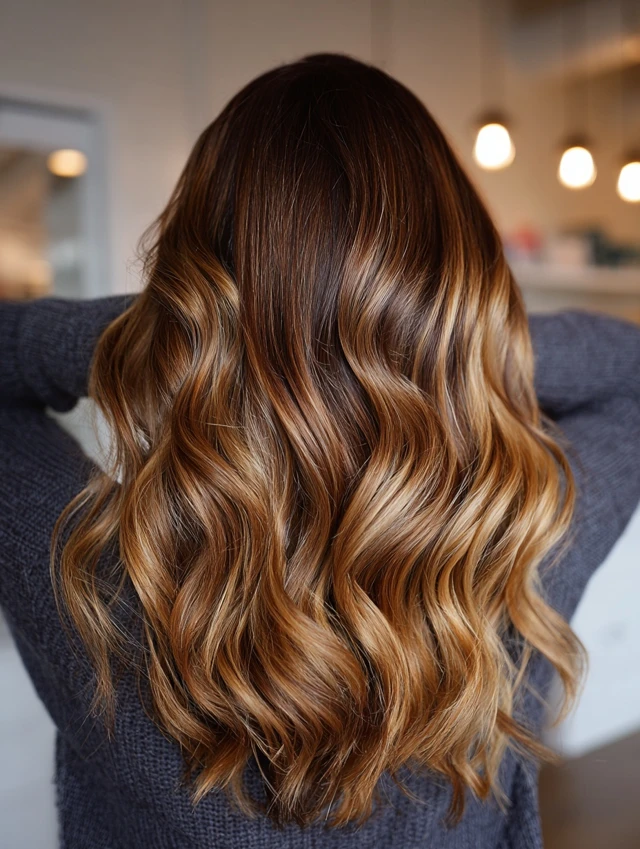 Warm caramel hair combined with chocolate brown highlights creates a deep, luxurious finish. The darker tones add richness and balance.