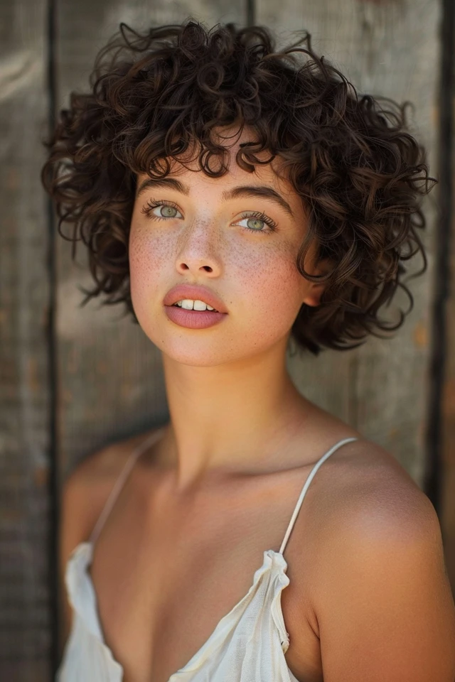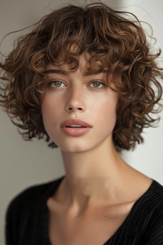 A tousled curly cut embraces a slightly messy finish that enhances natural texture. Layers create separation, helping the curls appear fuller and more dynamic.