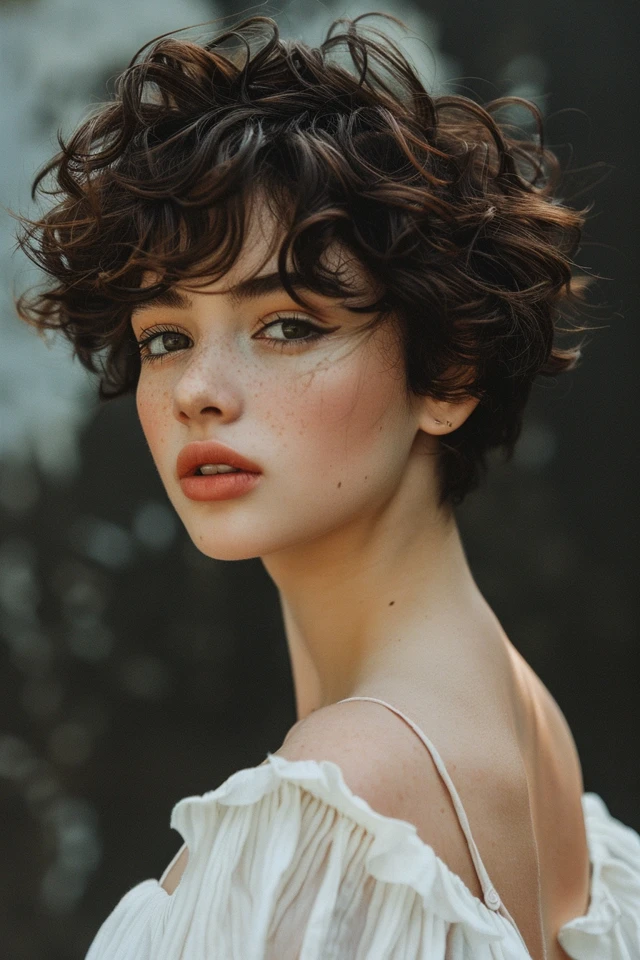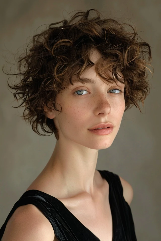 A curly pixie with volume at the crown focuses on lifting the top while keeping the sides neat. This creates a fuller silhouette and adds dimension to fine hair.