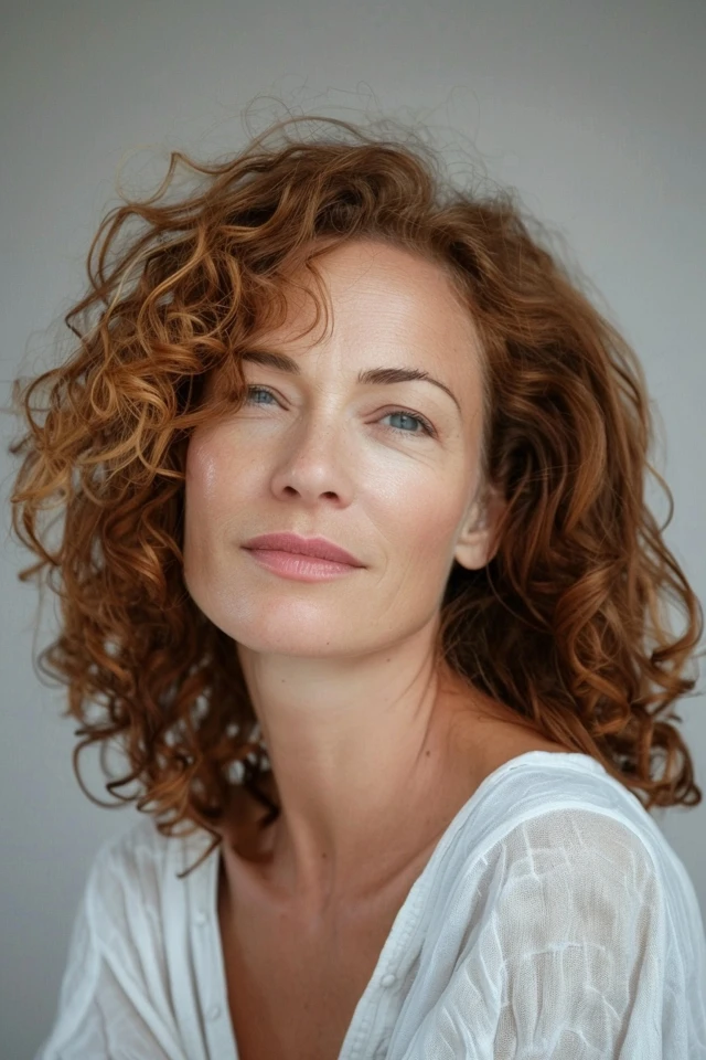 Styling enhances the natural curl pattern, creating a cohesive and balanced look. The result feels youthful and soft, offering both volume and shape.