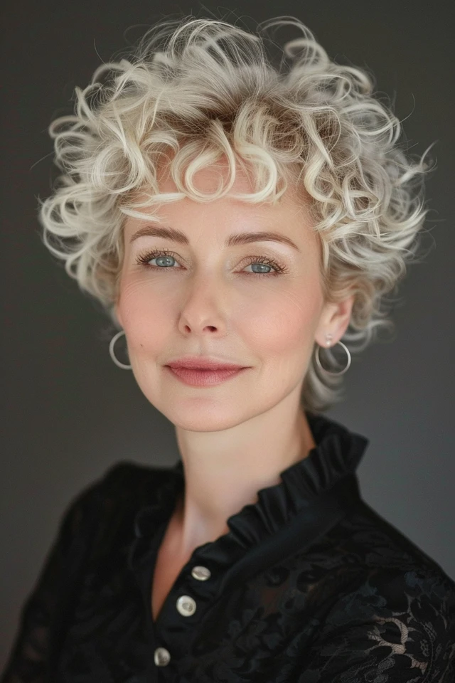 A root-lifting spray helps maintain height, while a curl cream defines the texture. The style feels bold yet manageable, offering a modern approach to short curly hair.
