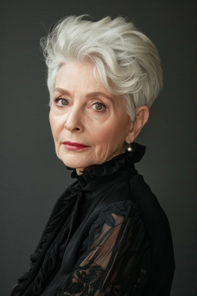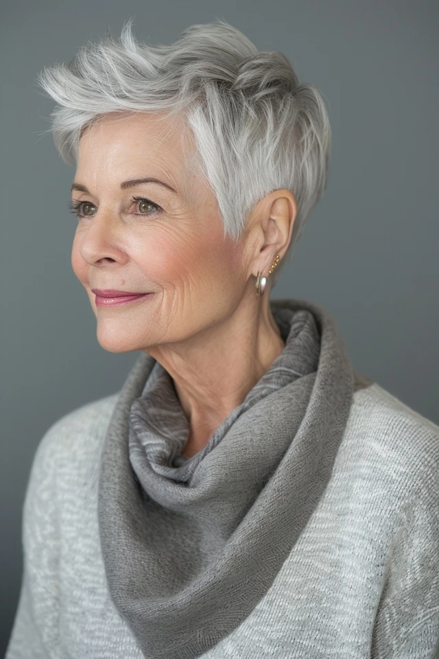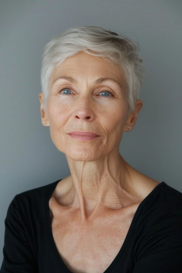 A soft classic pixie keeps the sides and back short while maintaining gentle length on top. This creates a balanced and flattering silhouette that highlights facial features.