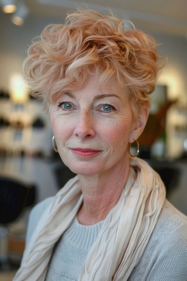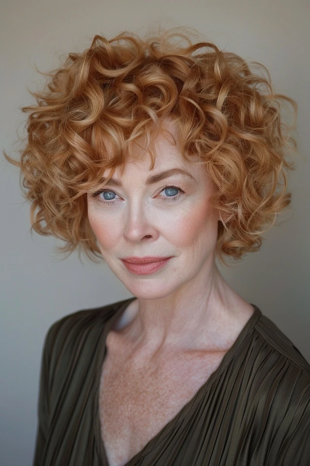 A soft curly crop embraces natural texture while maintaining a controlled shape. The curls add volume and movement.