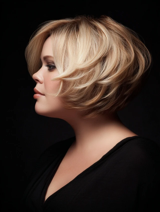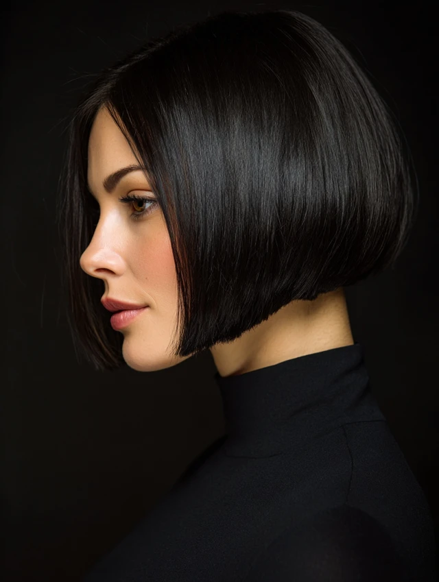 A stacked bob adds volume at the back, creating a lifted and structured shape. The layers build fullness while keeping the front sleek.