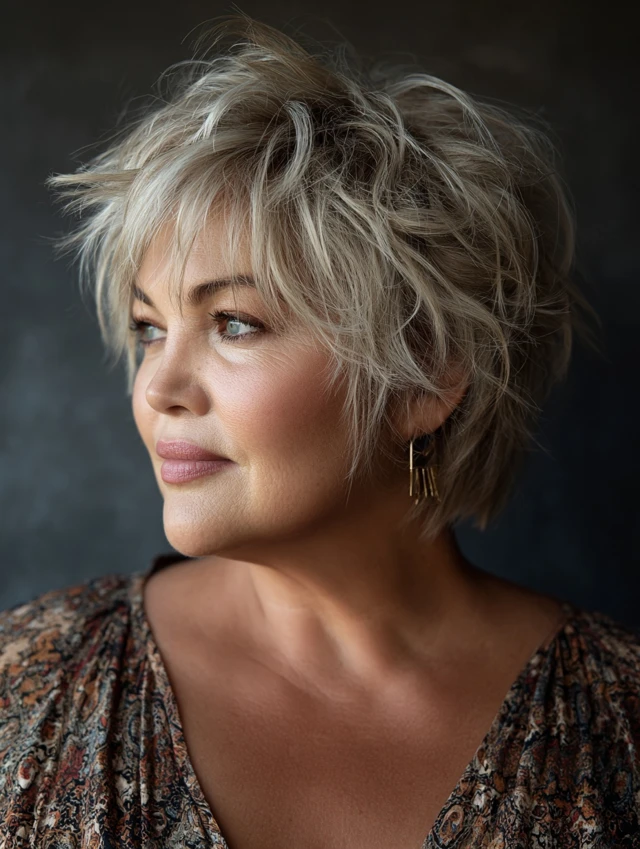 A textured pixie cut with volume on top creates height and balance, helping to elongate the face. The layers add movement, preventing the style from appearing flat or heavy.