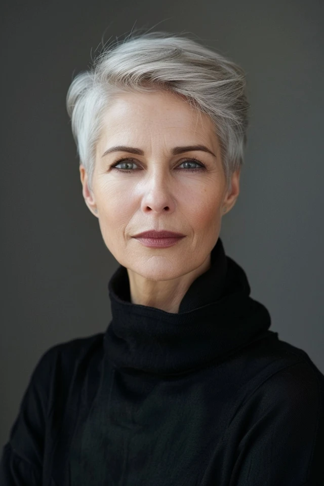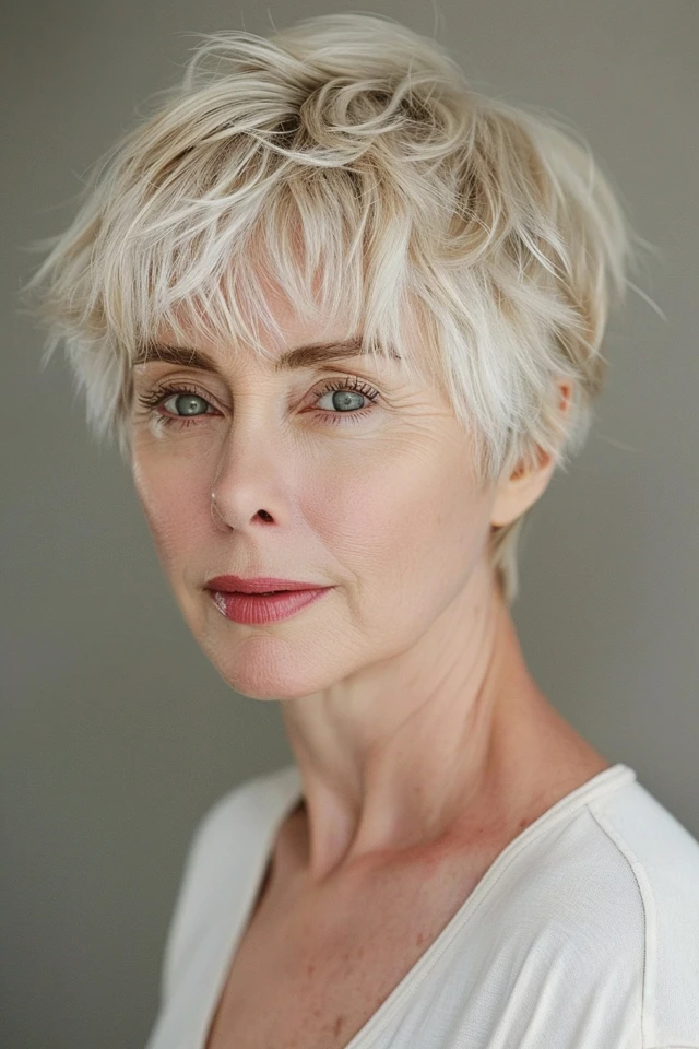 A pixie with a soft fringe adds gentle face-framing while keeping the style light and manageable. The fringe blends naturally into the cut.