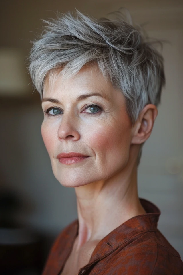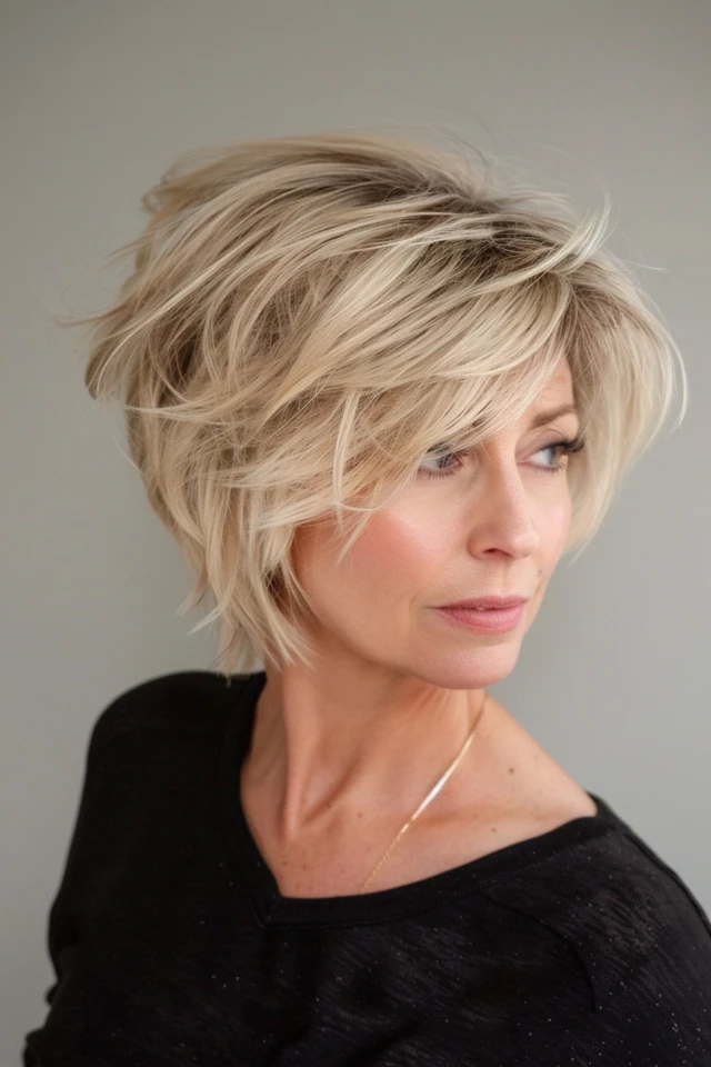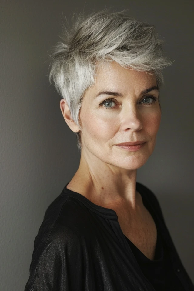 A soft layered pixie adds gentle movement while keeping the overall shape light and manageable. The layers help create natural lift without requiring heavy styling.