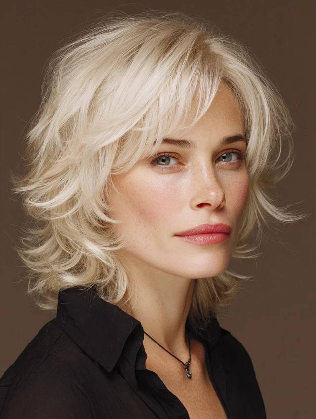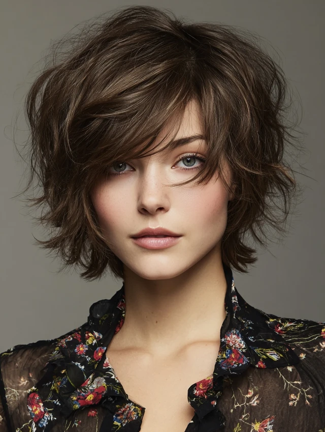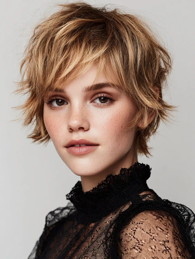 A layered shag with wispy sections around the face creates a relaxed, textured look. The framing adds softness.