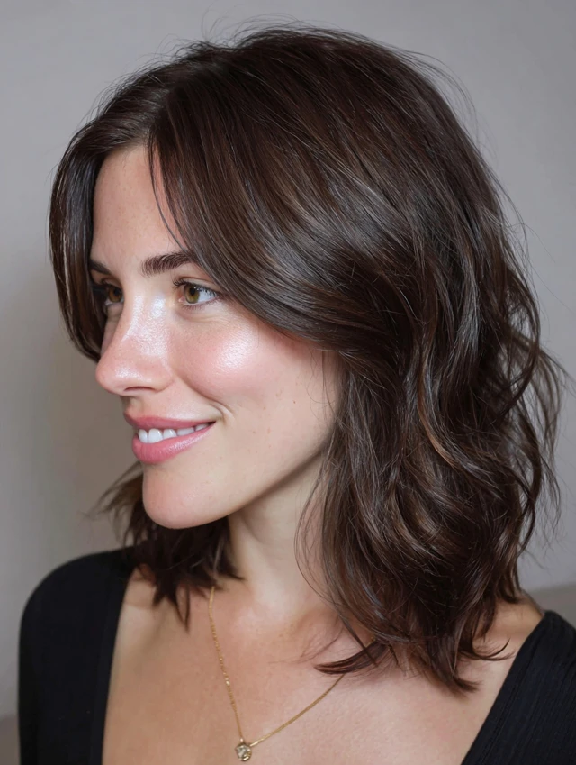 A shoulder-length cut with waves and face-framing layers adds movement and texture. The waves enhance the framing effect.