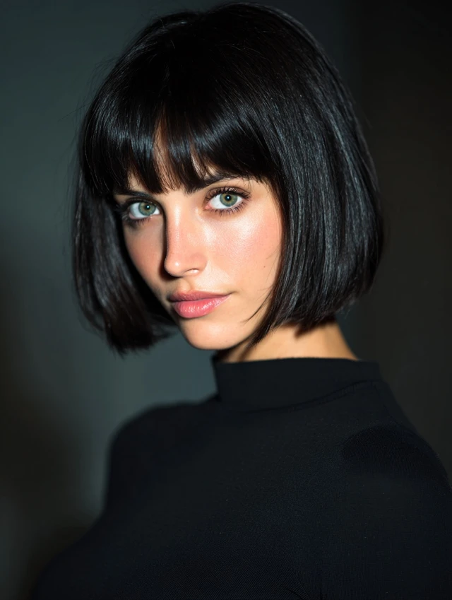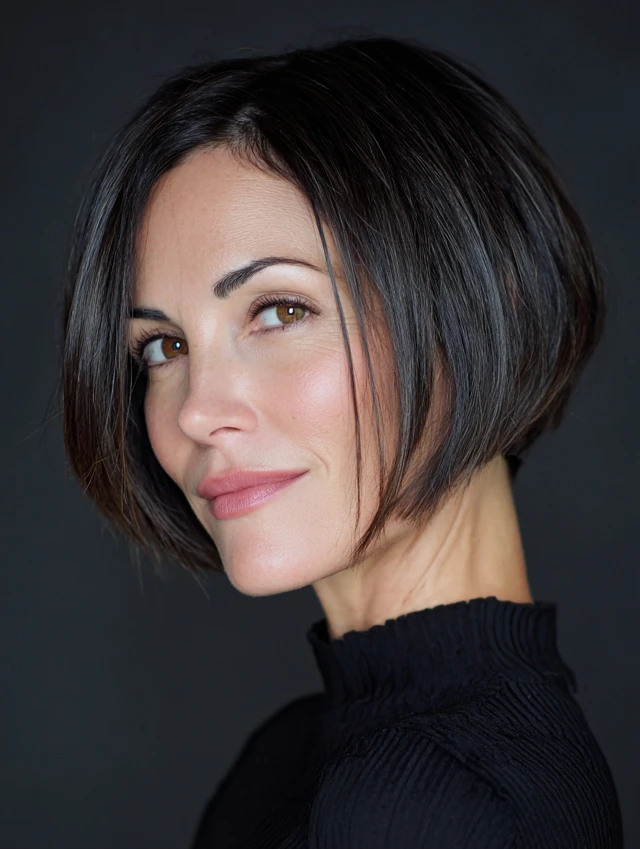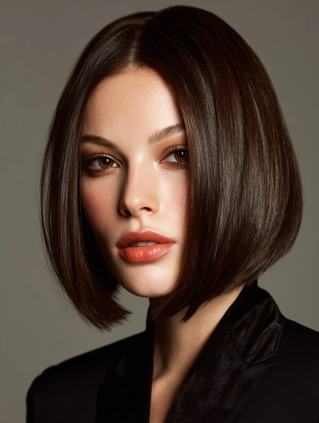 A chin-length bob with angled layers creates structure and elongation. The front pieces draw attention downward.
