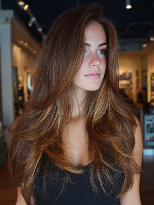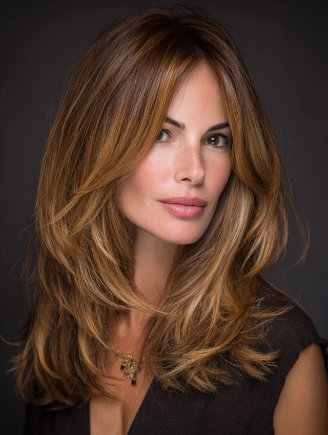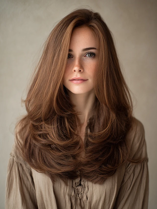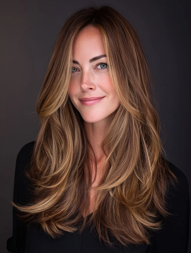 Long layers with natural face-framing flow create a soft, effortless look. The layers enhance movement and dimension.