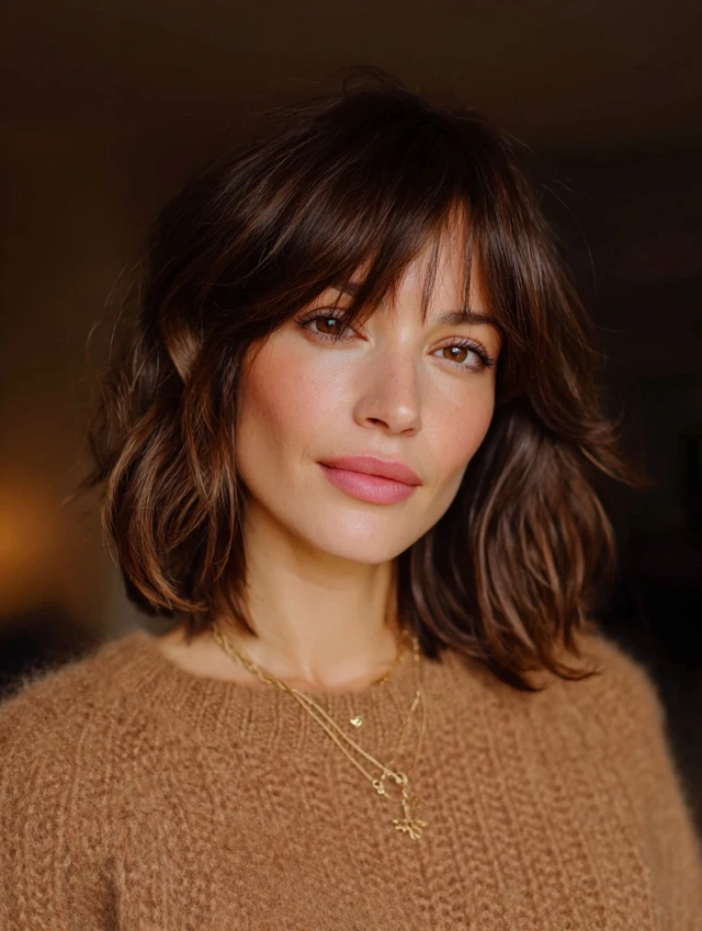 A long bob with curtain bangs creates a soft frame around the face. The bangs blend naturally into the layers.
