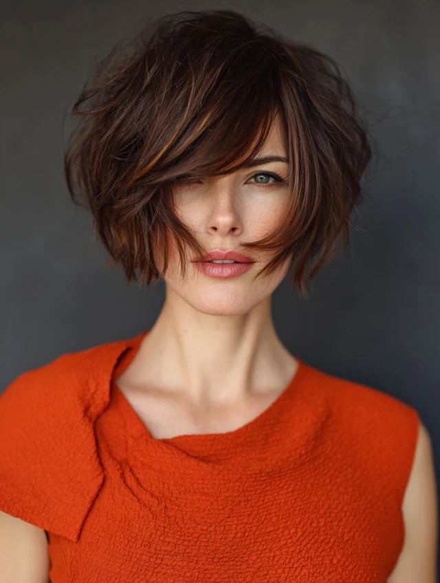 Long side bangs paired with a short bob create a diagonal frame across the face. This adds structure and softness.