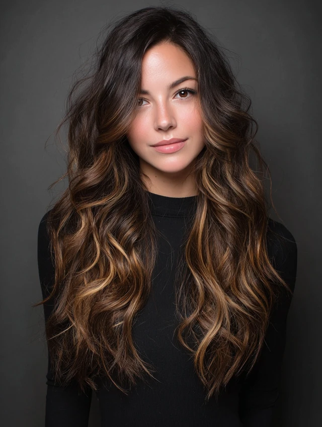 Long layers paired with subtle highlights around the face create brightness and movement. The highlights enhance natural features.
