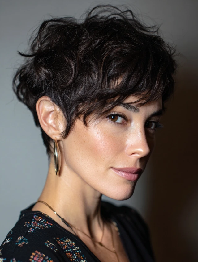 A pixie cut with longer front sections creates contrast while framing the face beautifully. The added length softens the look.