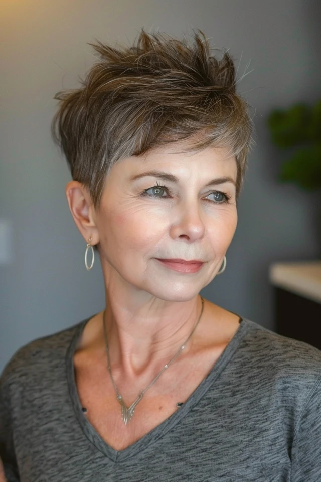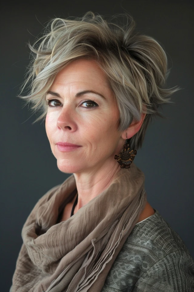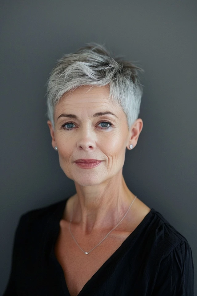 A soft layered pixie creates gentle movement while keeping the overall shape light and manageable. The layers add natural lift, helping the hair look fuller without effort.
