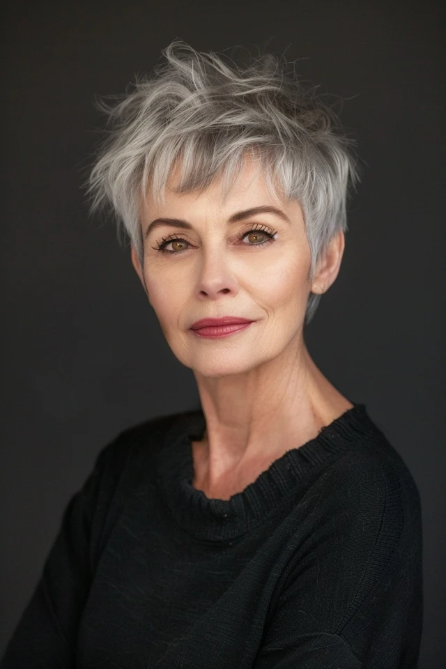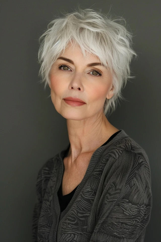 A pixie with a soft fringe adds gentle face-framing while keeping the style light. The fringe blends naturally into the cut.