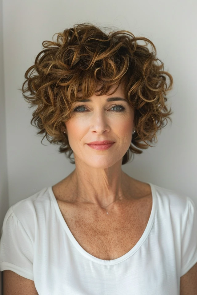 A short curly crop embraces natural texture while maintaining a controlled shape. The curls add volume and movement throughout.