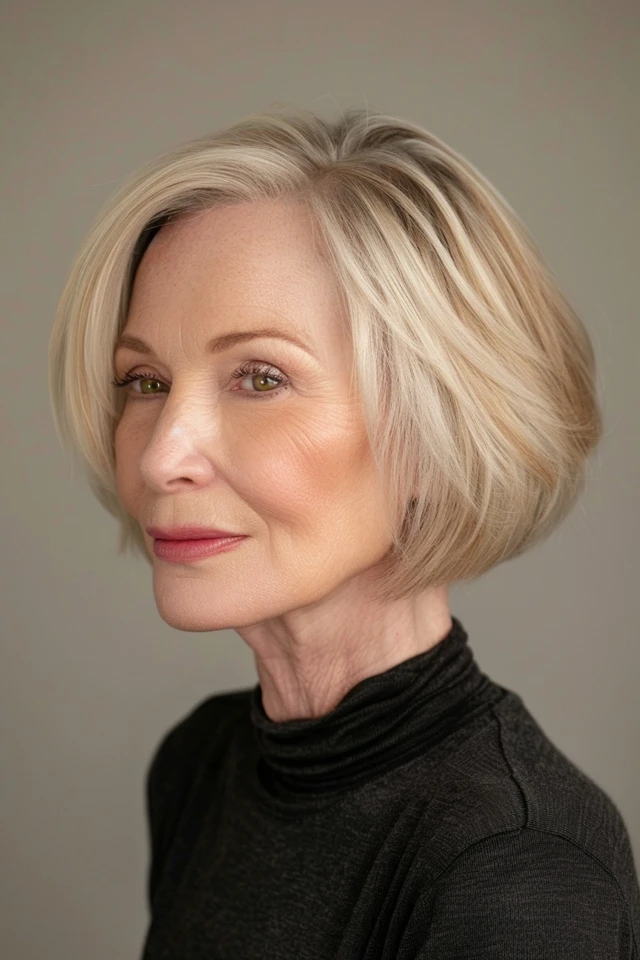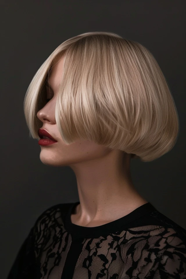 A sleek short bob emphasizes smooth lines and a polished finish. The clean shape helps the hair appear fuller and more defined.