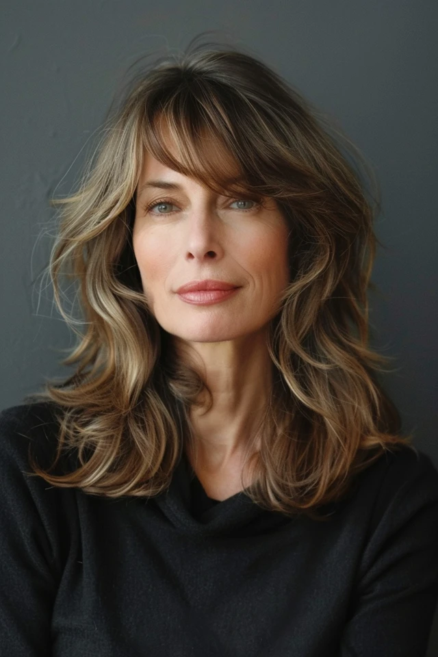 Side bangs create a soft diagonal line that frames the face while layers add movement. This combination enhances dimension without adding heaviness.
