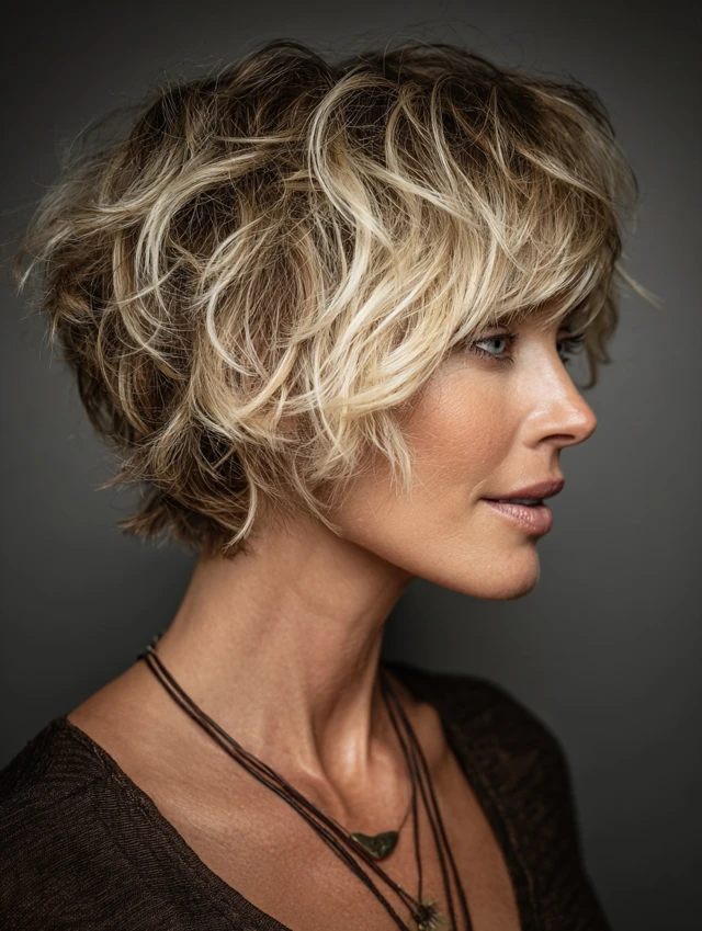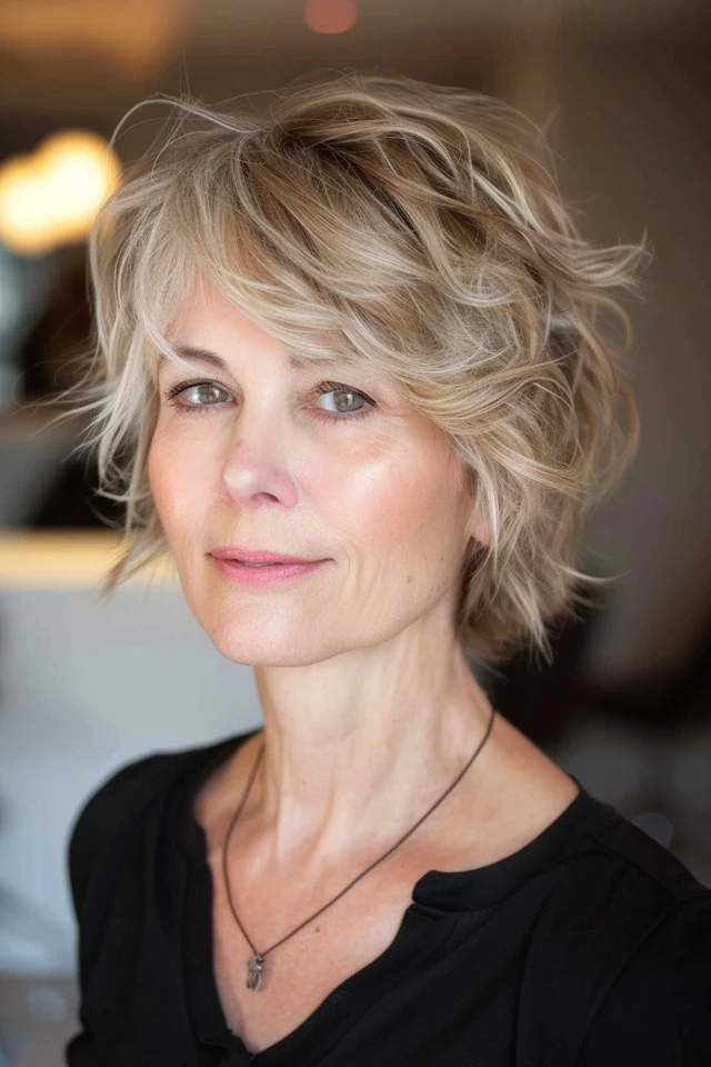 A textured crop with a tousled finish creates a relaxed and effortless appearance. The layers add movement and natural volume.