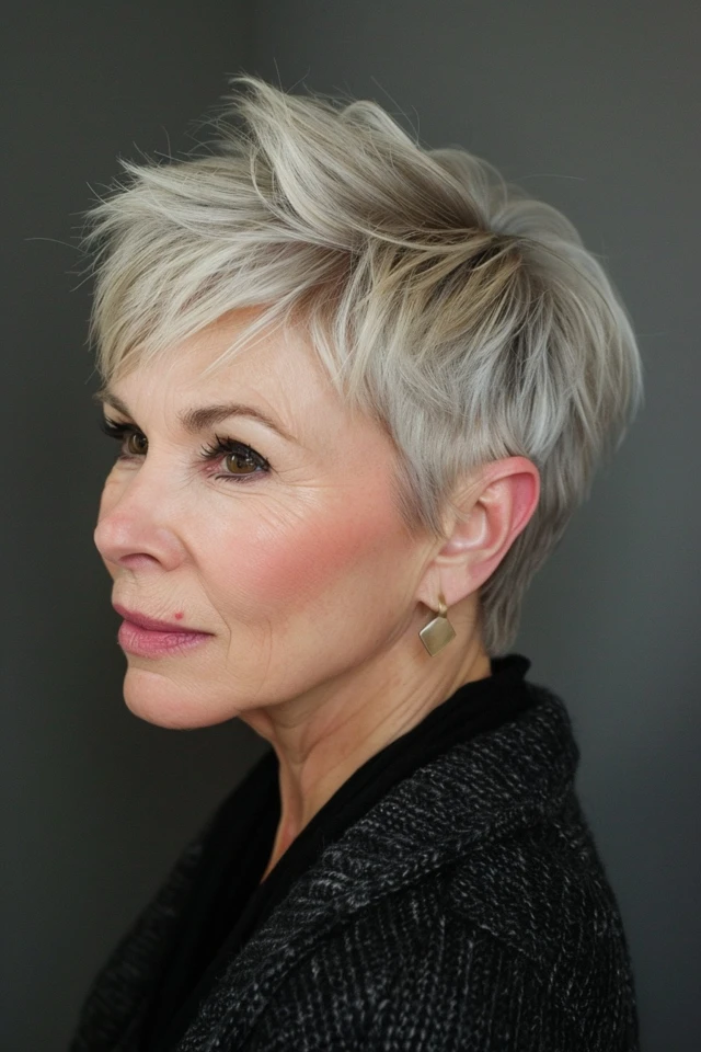 A side-swept fringe adds softness and movement to a pixie cut. It creates a flattering frame that draws attention to the eyes.