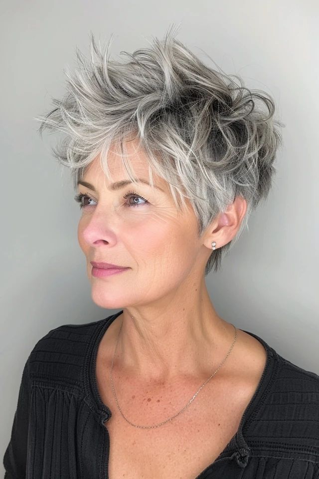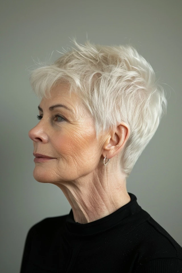 This pixie variation emphasizes height at the crown while keeping the sides neat. The added lift creates a balanced and flattering shape.