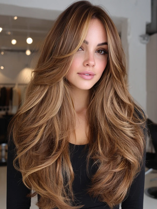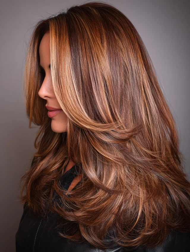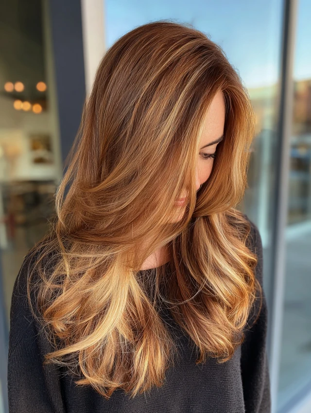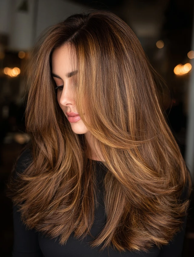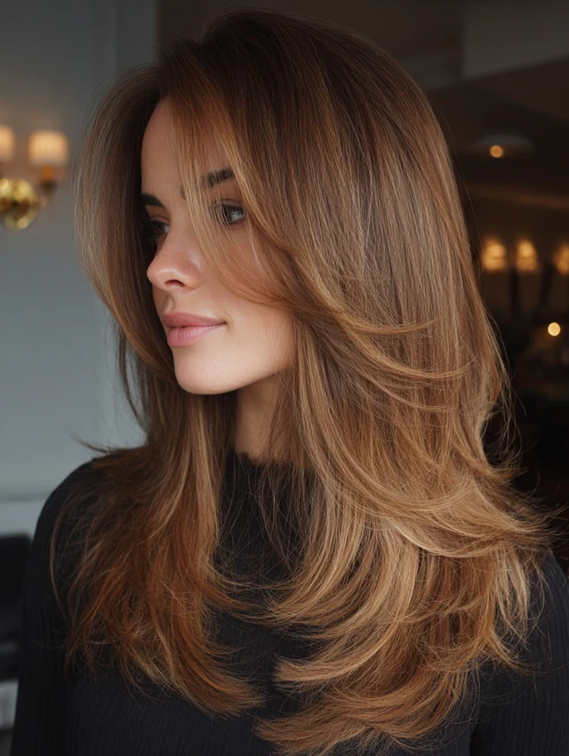 Caramel Hair with Money Piece and Curtain Layers