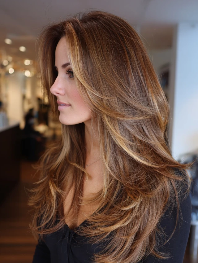 Layers paired with a caramel base and money piece create movement and dimension. The front highlights blend into the layered structure.