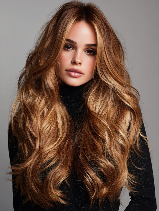 Warm caramel hair with a golden money piece adds radiant brightness to the front sections. The golden tones create a sunlit glow.