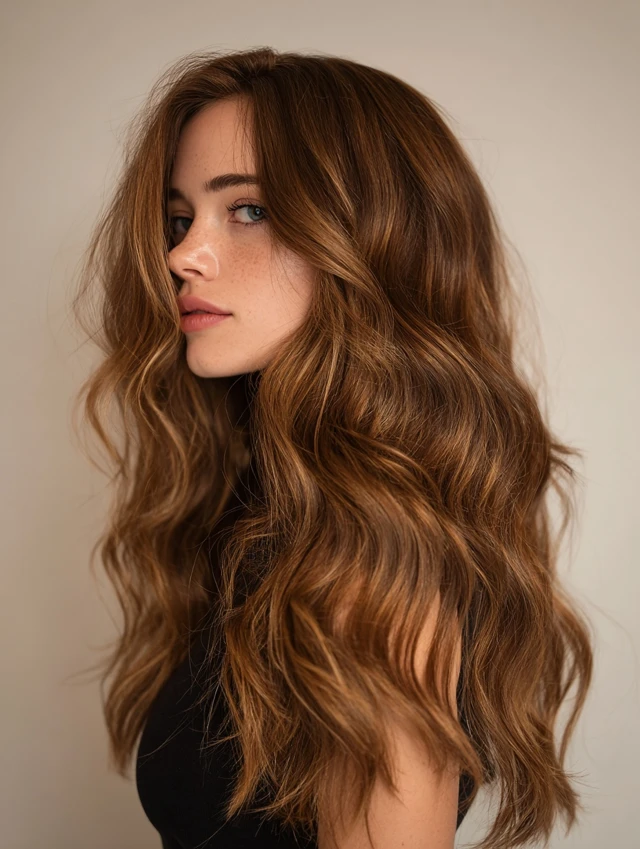 Soft waves enhance caramel hair with a money piece by showcasing the color variation. The texture adds movement and depth.