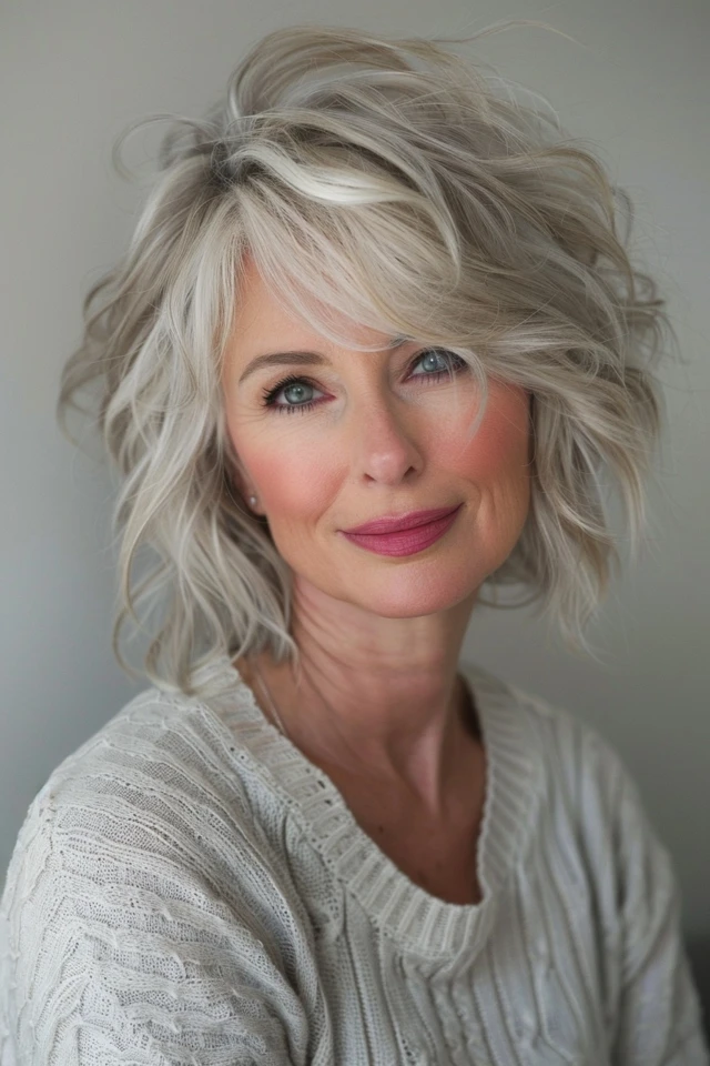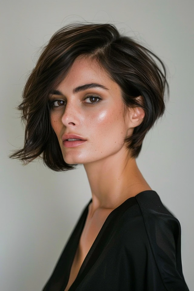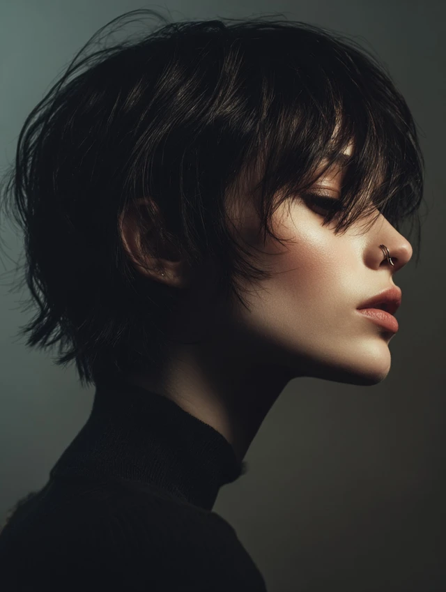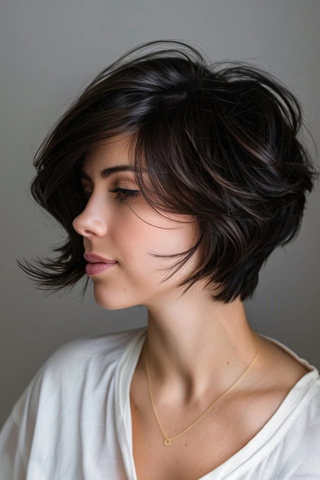 A short layered cut with a side part adds natural lift and movement. The layers reduce bulk, while the part creates height at the roots.