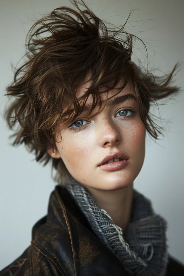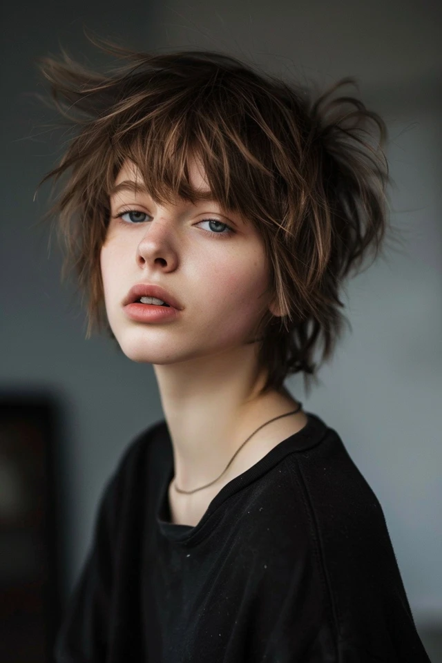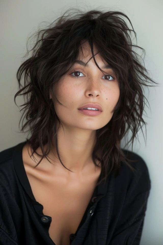 A short shag cut introduces choppy layers that break up density and create movement throughout thick hair. The uneven layering prevents the hair from forming a heavy, solid shape, instead giving it a more relaxed and textured appearance. This approach works especially well for naturally wavy or slightly coarse textures.