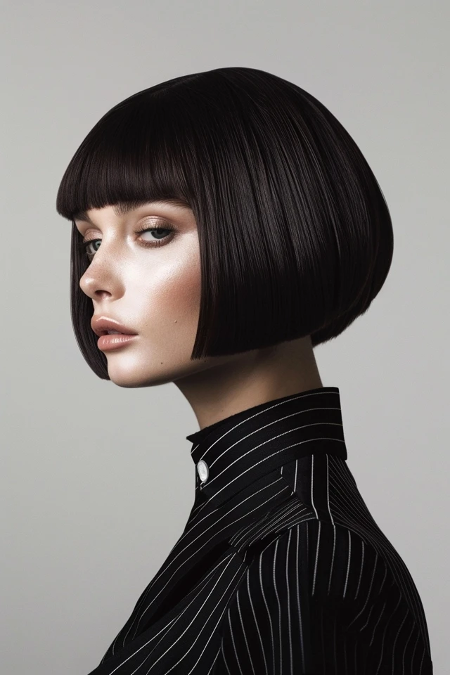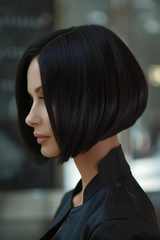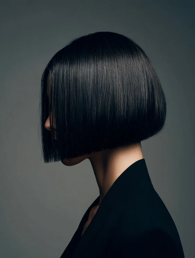 A sleek short bob focuses on smoothness and structure, helping thick hair appear controlled and refined. Subtle layers prevent the style from becoming too heavy.