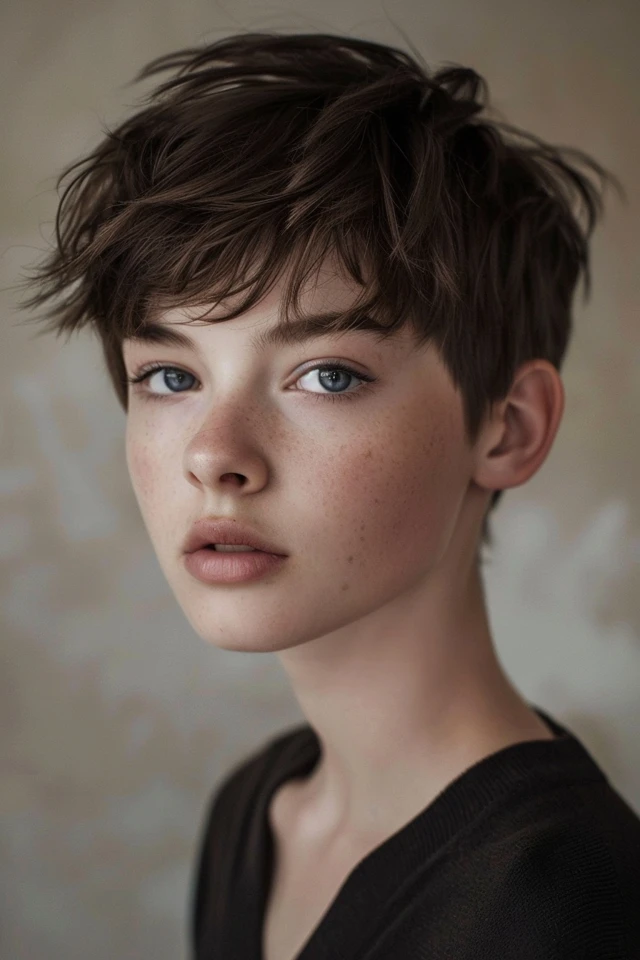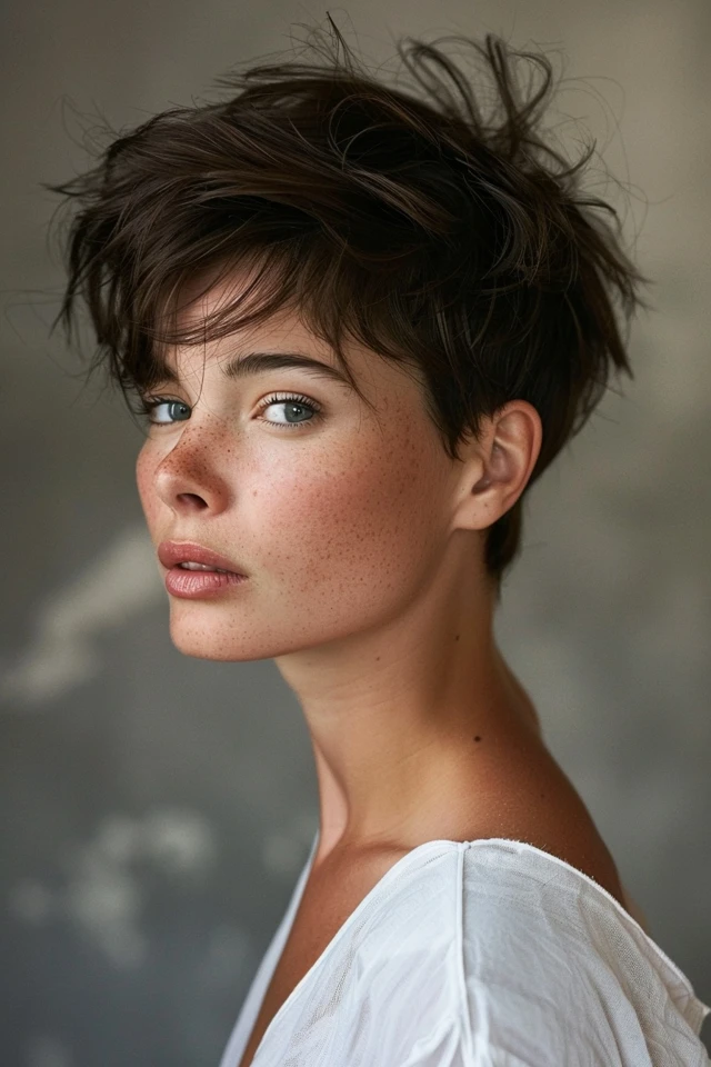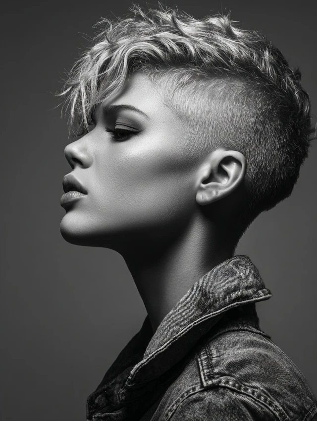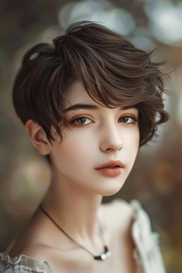 A textured pixie cut works exceptionally well for thick hair by removing bulk while keeping movement intact. Short layers throughout the crown and top prevent the hair from sitting too heavy, while the sides remain neatly tapered for balance. This combination creates a lightweight yet full appearance that feels structured without stiffness.