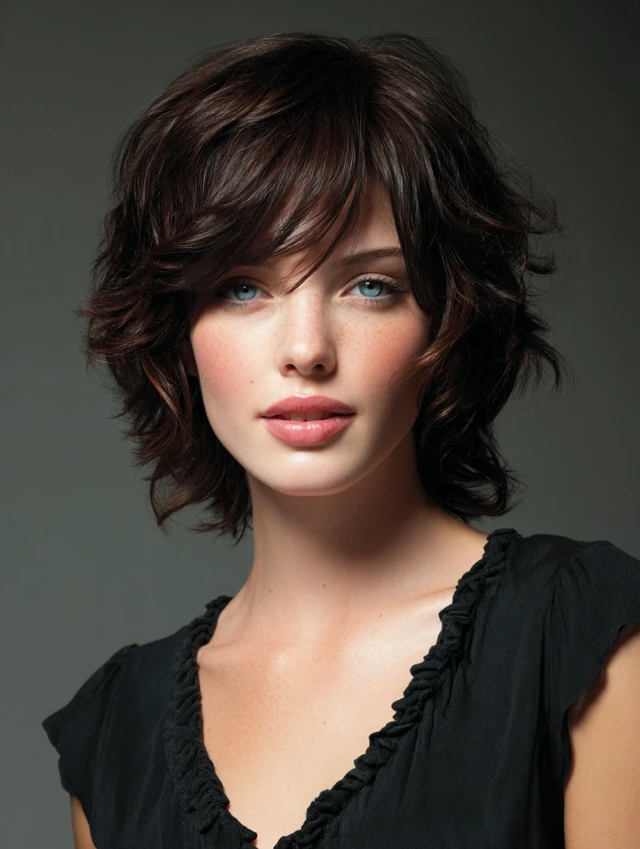 Textured layers add dimension and soften the roundness of the face.