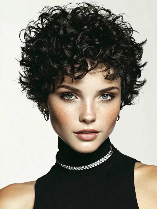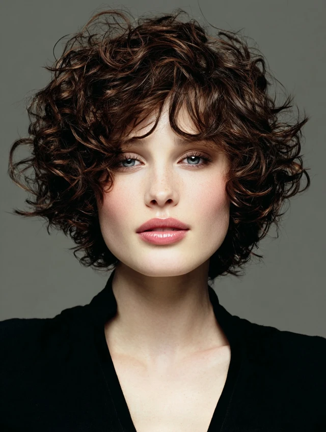 Curly hair adds softness and volume, balancing the natural shape of a round face.