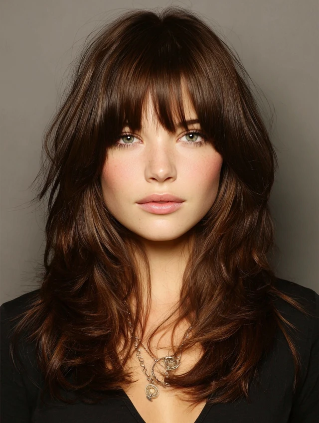 Layers create movement and volume while elongating the appearance of a round face.