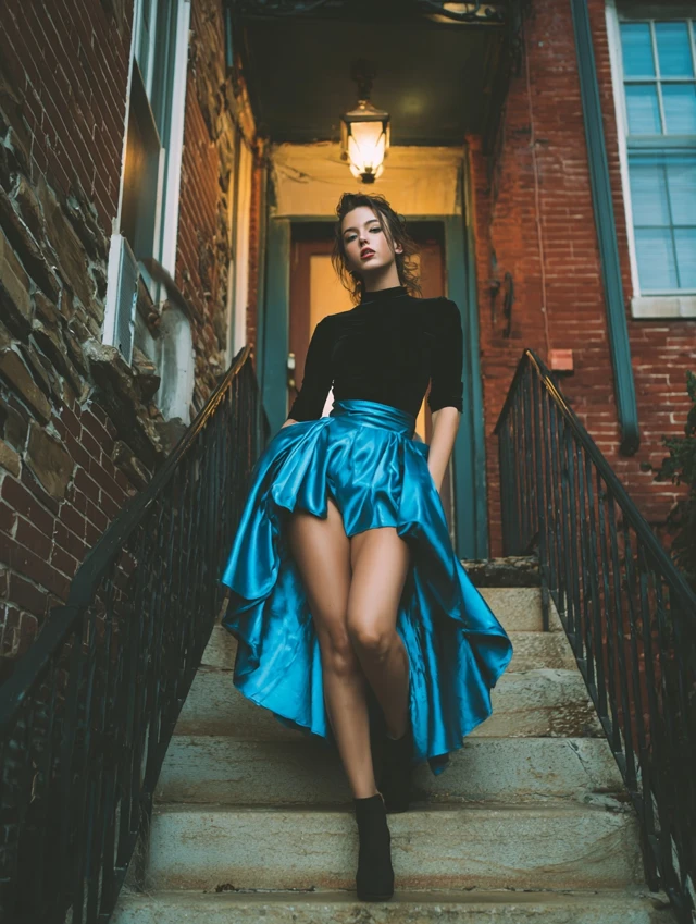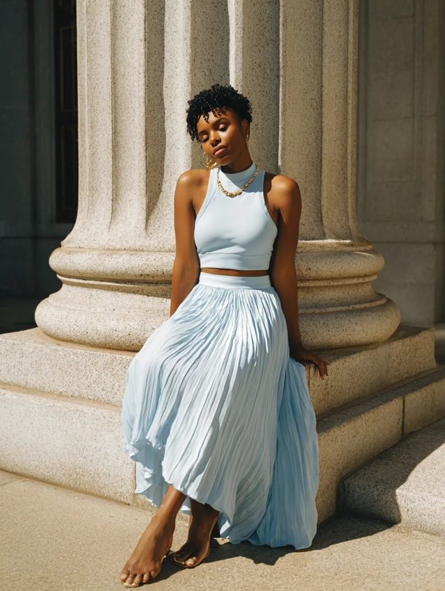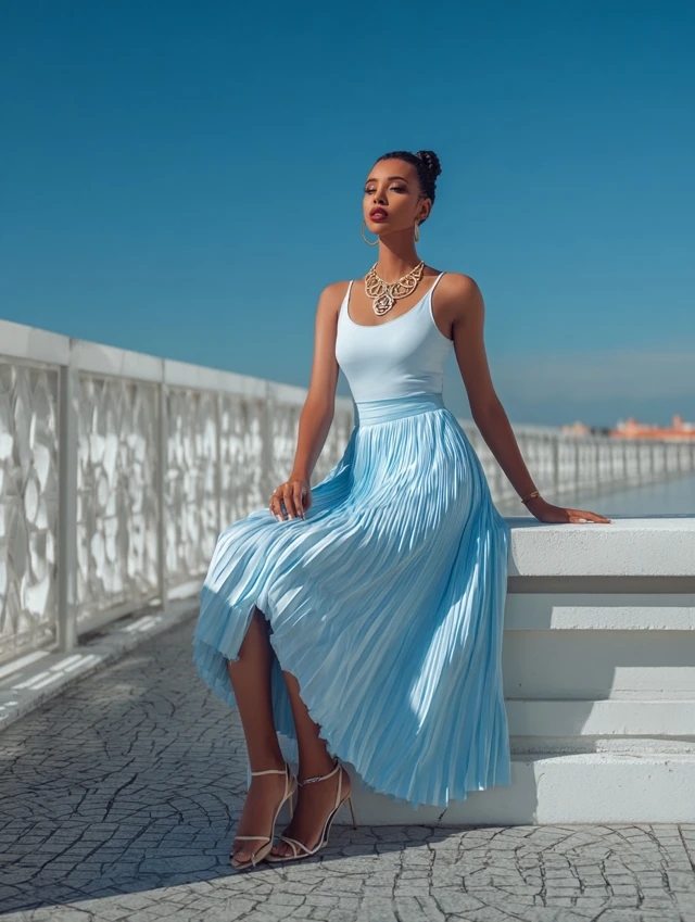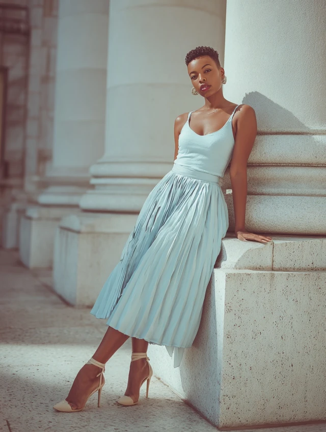 Blue is calm, but it’s also powerful. The key to styling it confidently is embracing its versatility. Whether you’re going casual or dressy, let your movement and personality complement the skirt’s natural flow.
