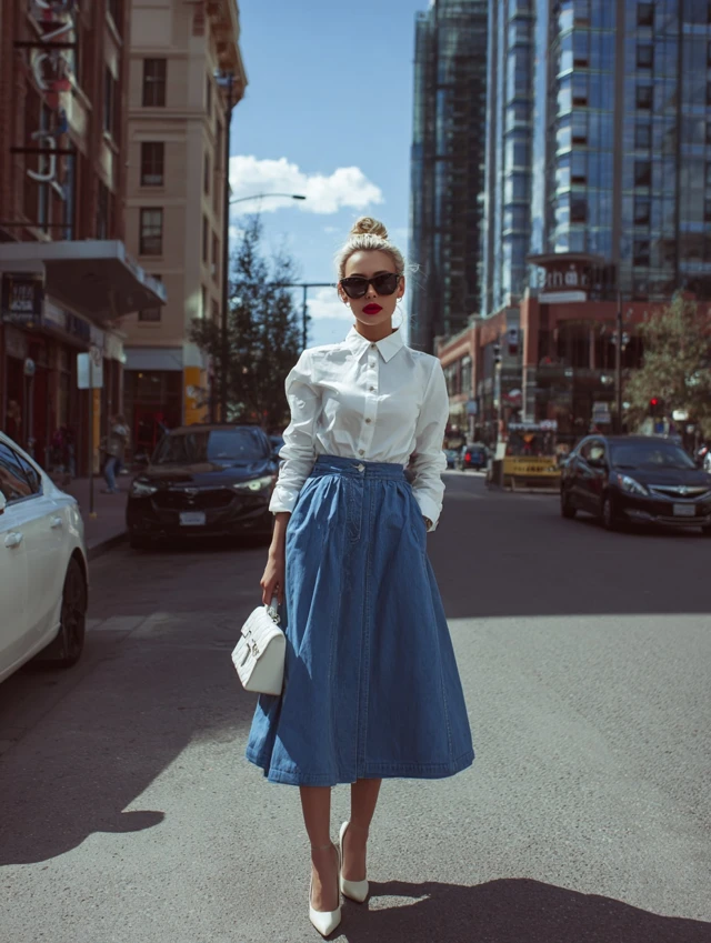 1. Denim Blue Skirt + White Button-Up