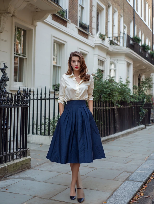 2. Navy Blue Midi Skirt + Cream Blouse