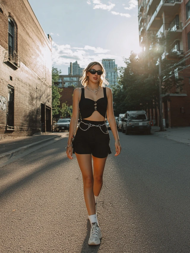 • Accessories: Layered necklaces, small crossbody bags, and sunglasses for polish.