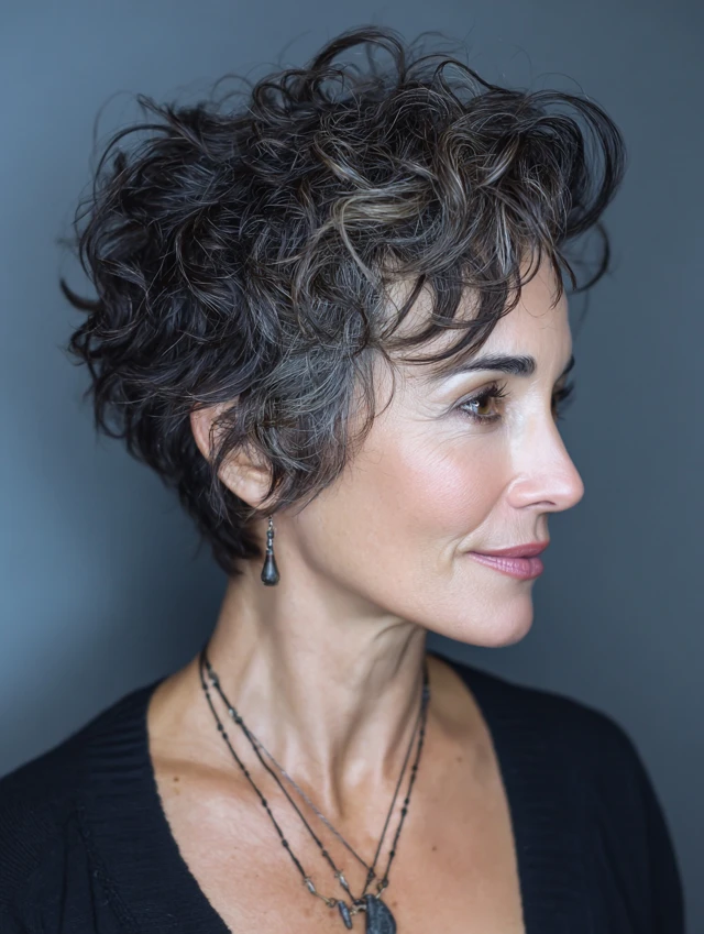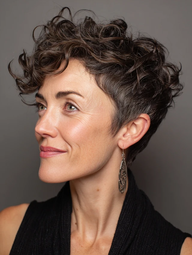 Curly texture enhances layers and adds dimension to a short pixie.