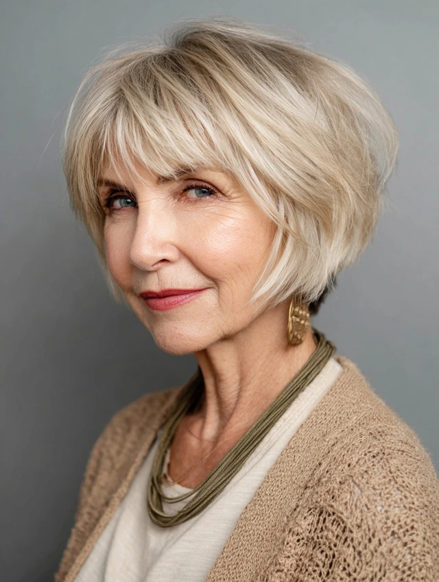 Layered bob hairstyles for women over 60 are a perfect blend of comfort and elegance. The soft layers add movement and volume while keeping the look natural and easy to maintain.