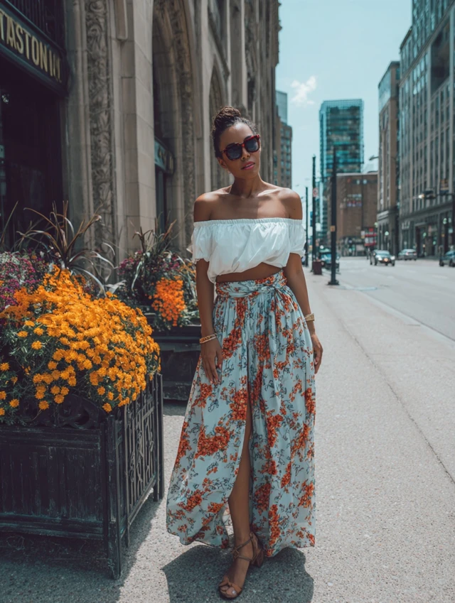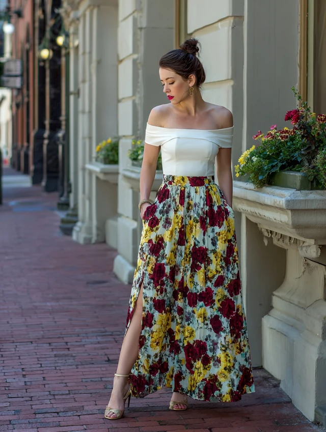 4. Floral Maxi Skirt + Off-Shoulder Top