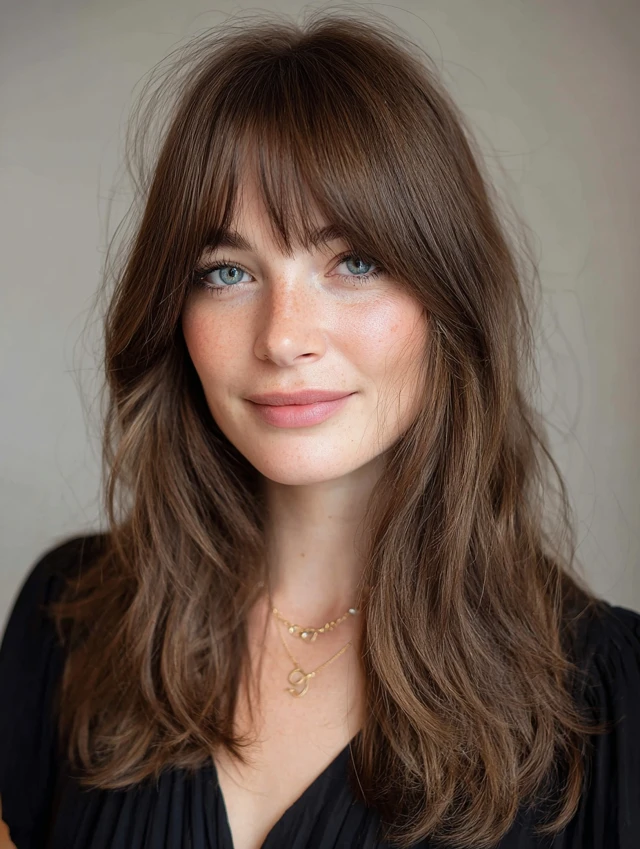 Curtain bangs, side-swept bangs, or wispy fringe.