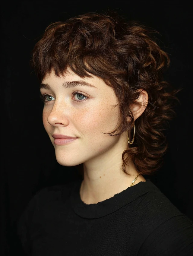 Curls enhance the layered shape, adding bounce and playful volume.
